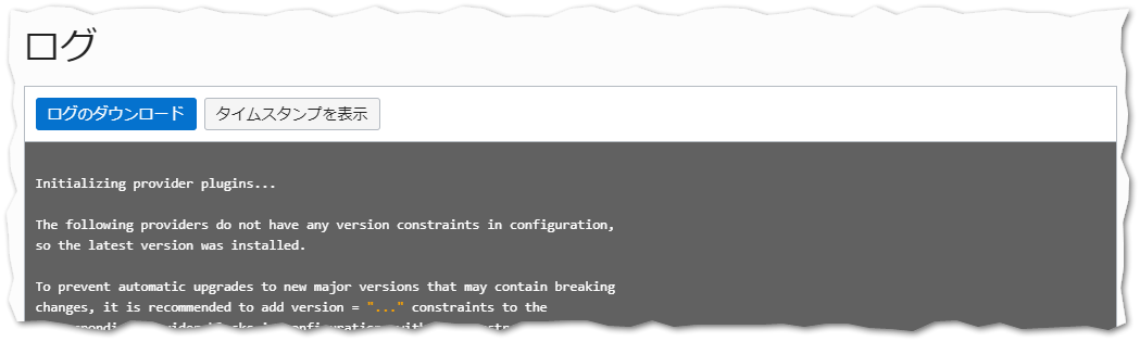 ジョブの完了には数分程度かかりますが、その間、ログに表示される内容を確認してみてください。Resource Managerはクラウドの環境内でTerraformを実行しており、その結果として標準出力に出力される内容がログに表示されます。