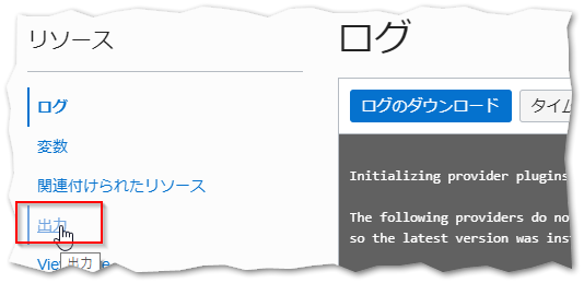 ジョブの実行が完了したら、実際にCLIの実行環境に接続してみましょう。画面左下にある出力をクリックしてください。