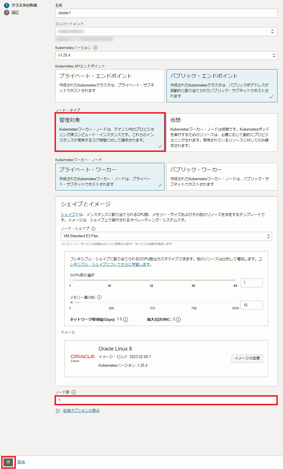 ノードの数はワーカーノードの数を指定します。デフォルトで「3」が指定されていますが、本ハンズオンでは最小構成である「1」に変更してください。