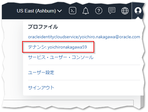 OCIコンソール画面右上の人型のアイコンをクリックし、展開したプロファイルからテナンシ:<テナンシ名>をクリックします。