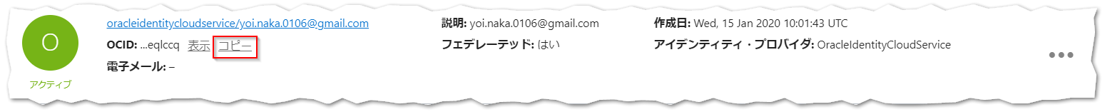 ユーザ情報が表示されますので、OCIDの右側にあるコピーをクリックすると、ユーザOCIDがクリップボードにコピーされます。