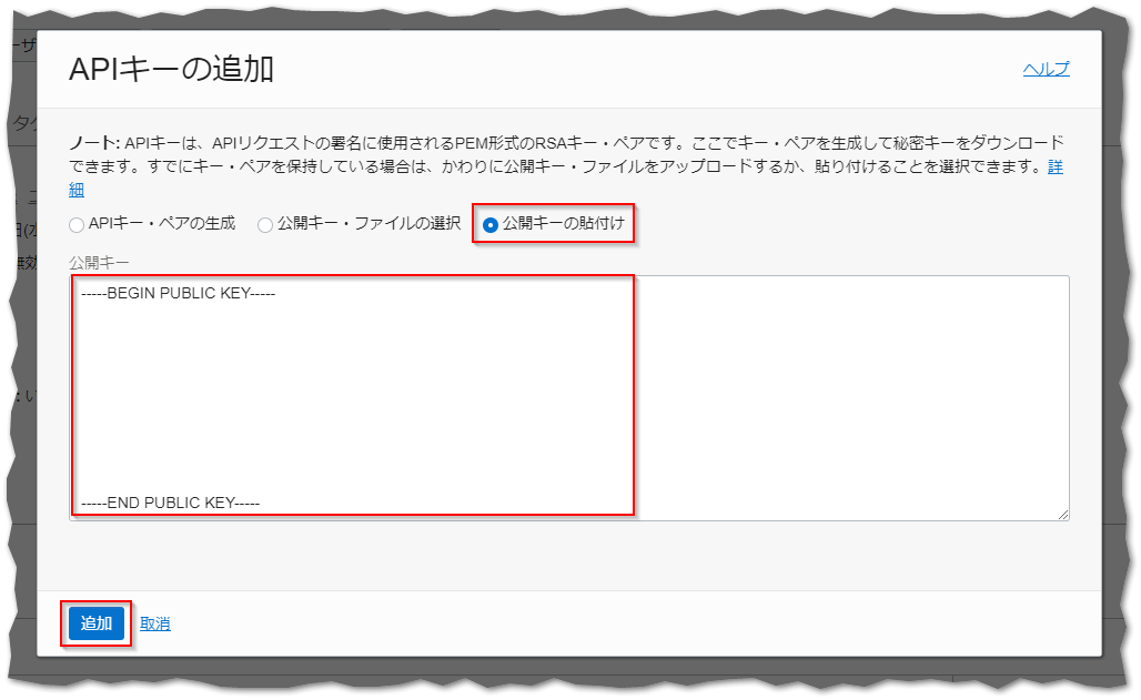 今回は、公開キーの貼付けをクリックし、先ほとTera Termに表示した公開鍵をペーストし、追加ボタンをクリックします(-----BEGIN PUBLIC KEY-----と-----END PUBLIC KEY-----の行も含めてペーストします)。