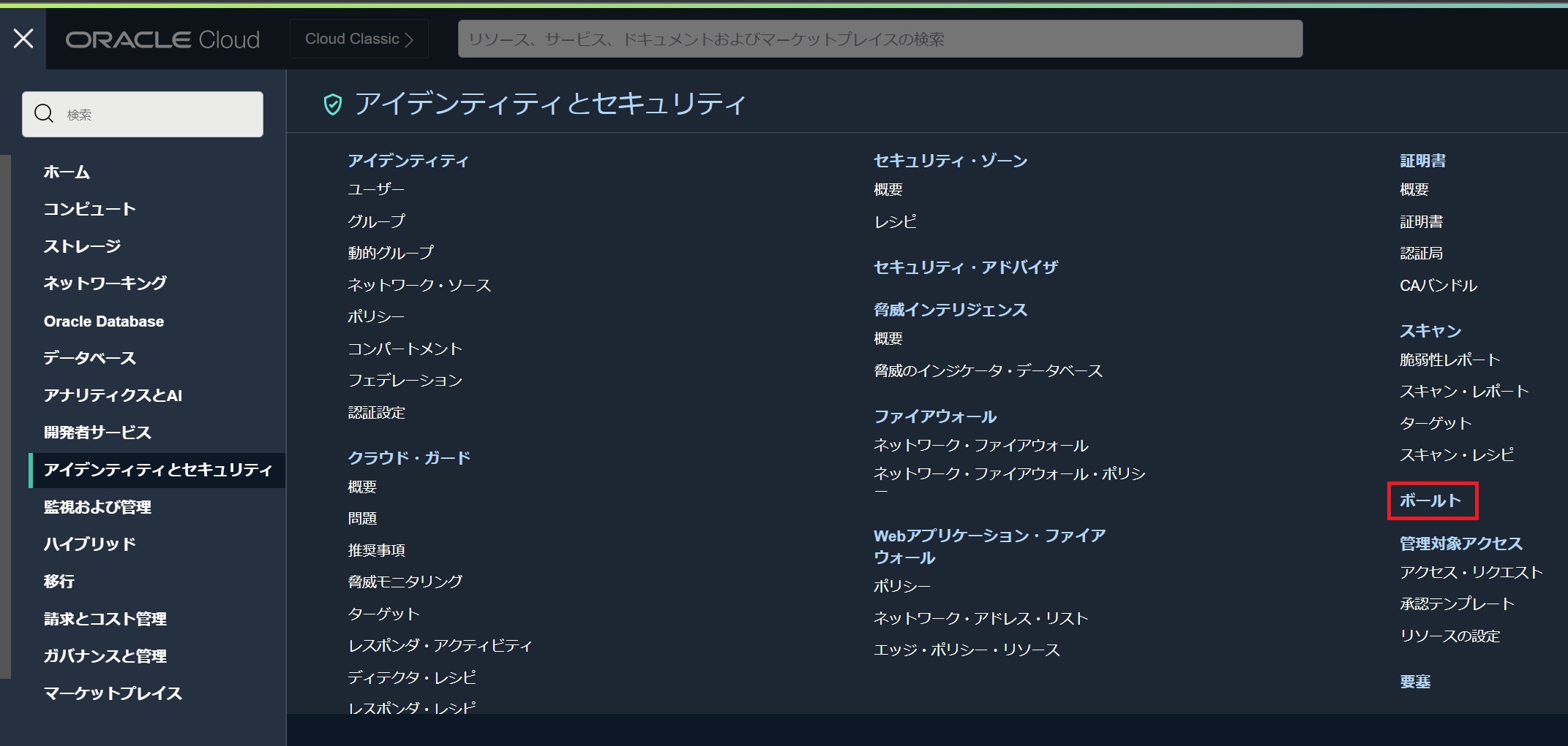 左上のハンバーガーメニューを展開して、「アイデンティティとセキュリティ」から「ボールト」を選択します。