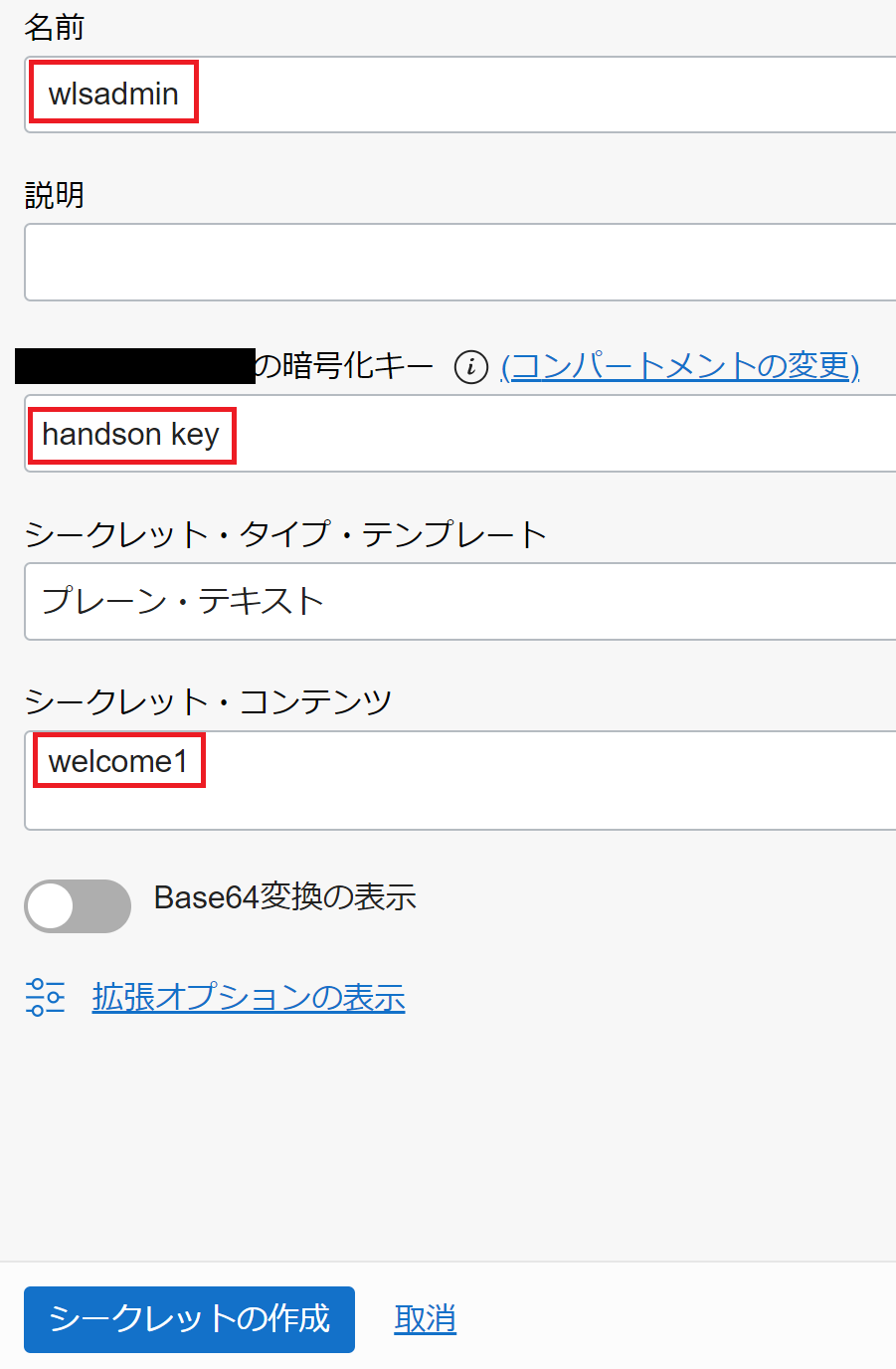 名前に「wlsadmin」と入力し、暗号化キーは「handson key」を選択し、シークレットコンテンツは「welcome1」と入力し、「シークレットの作成」をクリックします。