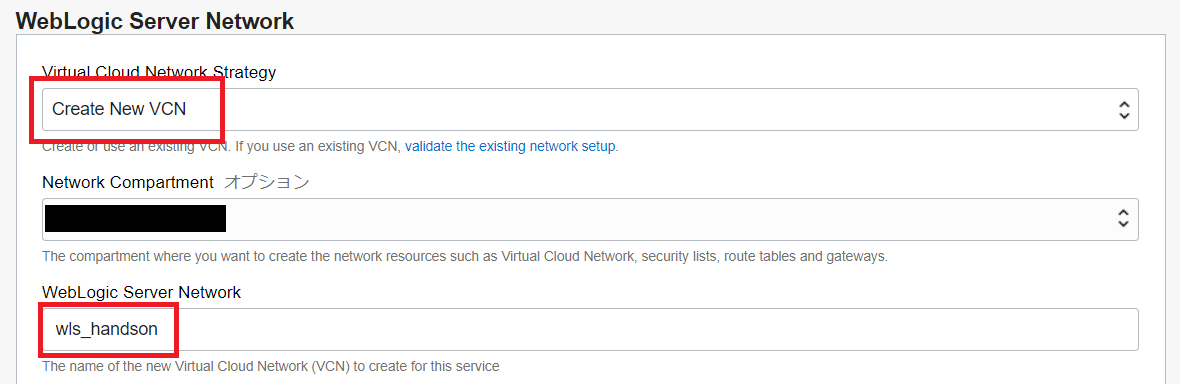 「Virtual Cloud Network Strategy」は「Create new VCN」を選択し、「WebLogic Server Network」は 「wls_handson」と入力します。