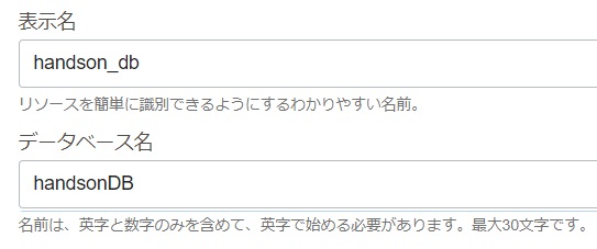 「表示名」に「handson_db」、「データベース名」に「handsonDB」と入力します。