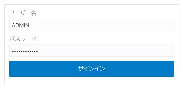 「ユーザー名」にADMIN、「パスワード」にWelcome1234!と入力します。※セッションの関係で、入力の必要がない場合があります。