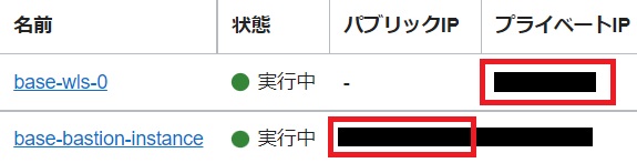 「base-bastion-instance」のパブリックIPと「base-wls-0」のプライベートIPを確認します。