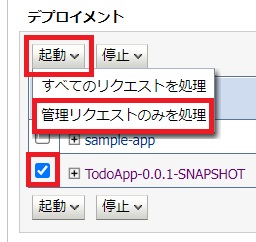 「TodoApp-0.0.1-SNAPSHOT」にチェックを入れ、「起動」をクリックし、「すべてのリクエストを処理」をクリックします。