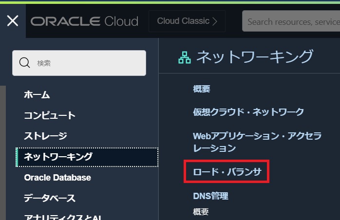 左上のハンバーガーメニューを展開して、「ネットワーキング」から「ロード・バランサ」を選択します。
