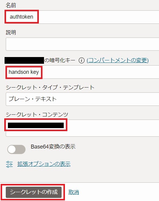 名前に「authtoken」と入力し、シークレットコンテンツは「1.4. Auth Tokenの作成」で作成したトークンを入力し、シークレットを作成します。