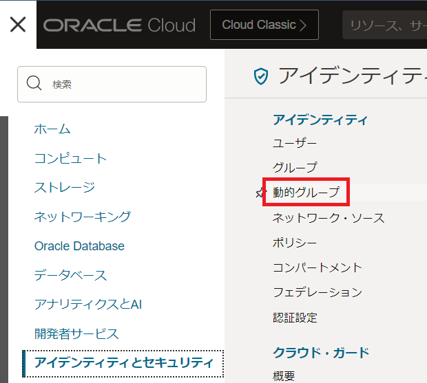 左上のナビゲーション・メニューを展開して、「動的グループ」を選択してください。