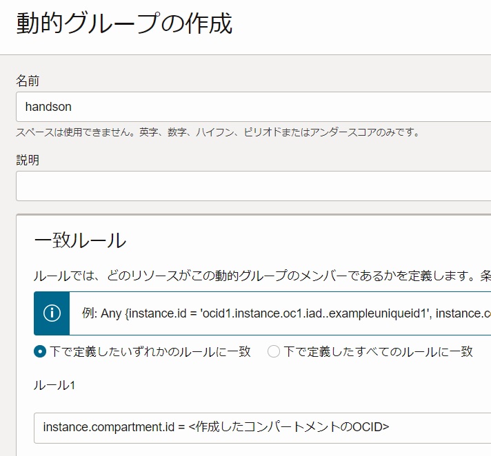一致ルールには以下のルールを記述してください。コンパートメントのOCIDは、1.1.でコピーしておいたものを利用してください。