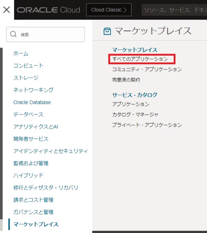 左上のハンバーガーメニューを展開して、「マーケットプレイス」から「すべてのアプリケーション」を選択します。