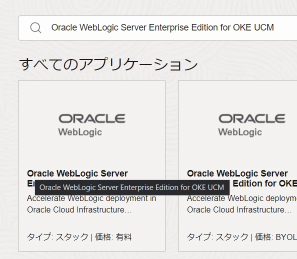 検索欄に「Oracle WebLogic Server Enterprise Edition for OKE UCM」と入力し、先頭に出てくるパネルをクリックします。