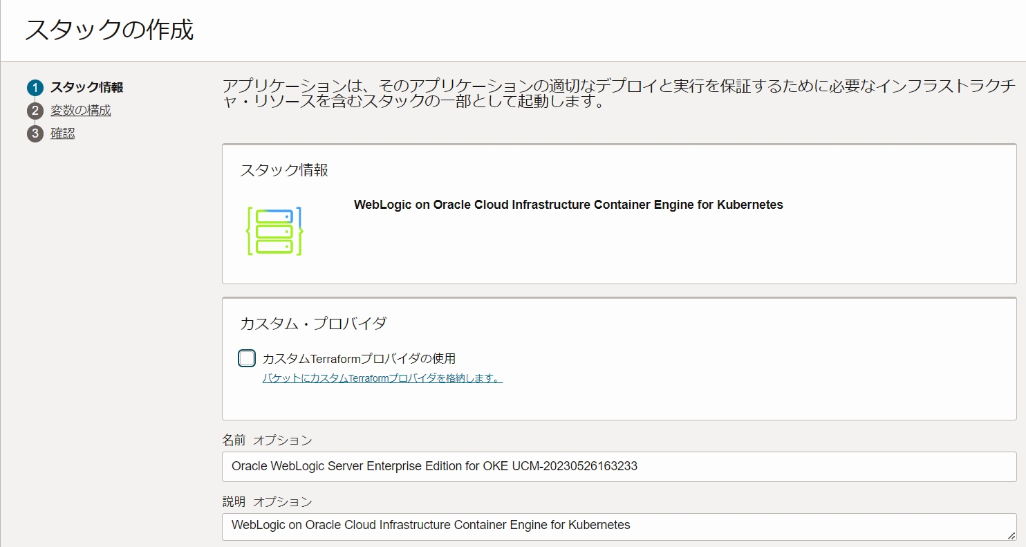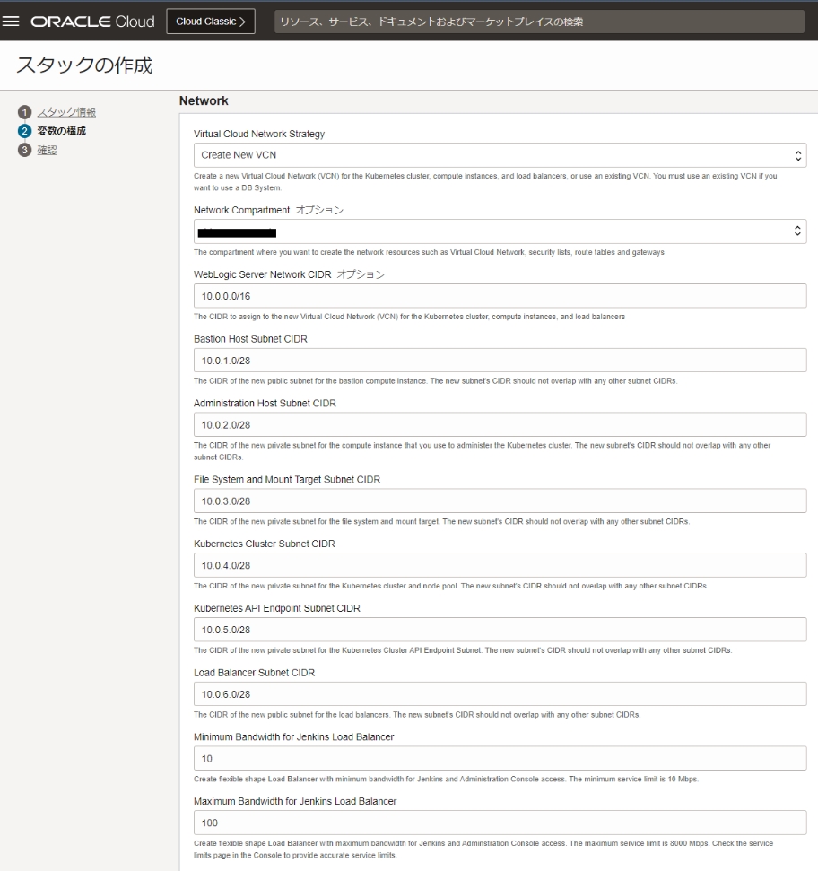 バージョンはデフォルトのまま、コンパートメントは「wls4oke」を選択します。