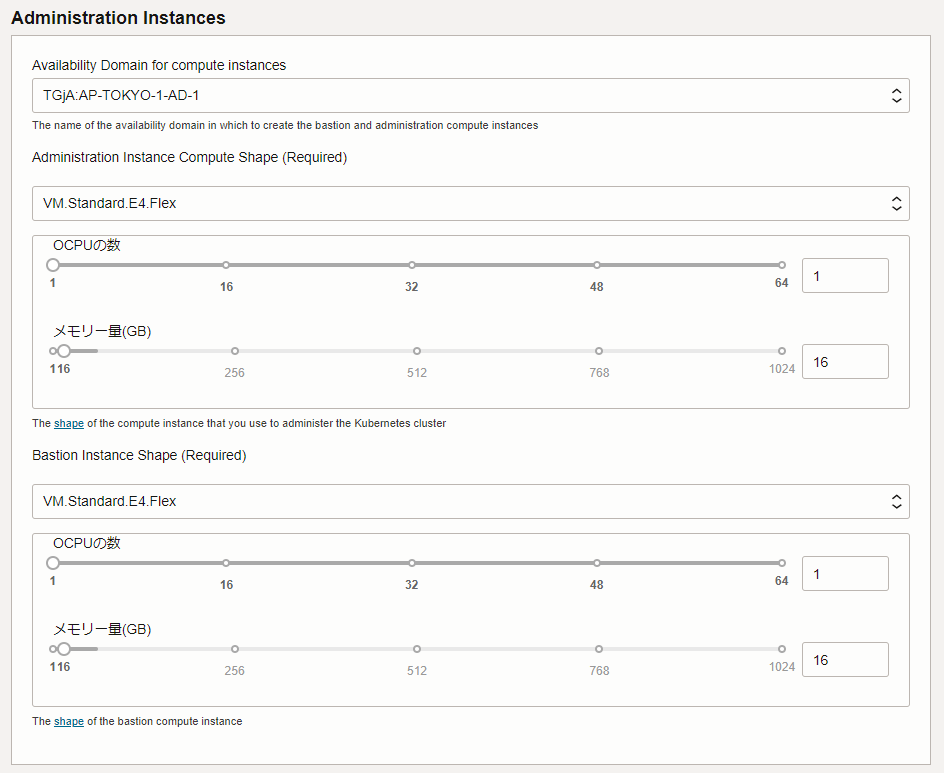 「Administration Instances」においてもコンピュートのシェイプを選択します。