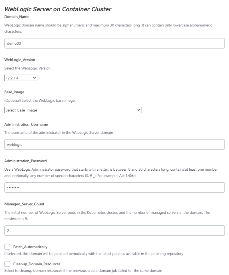 | Domain_Name | 作成するWebLogicドメインの名前。 ここでは demo00。 |