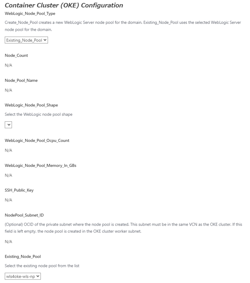 | WebLogic_Node_Pool_Type | 新しくWebLogic Node Poolを作るか、既存Poolを使うかを選択。 ここでは Existing_Node_Poolを選択。 |