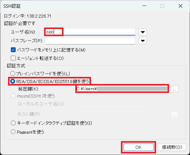 - SSH鍵 - 1. VMクラスタおよびデータベースの作成で追加した公開鍵と対になる秘密鍵を使用します。