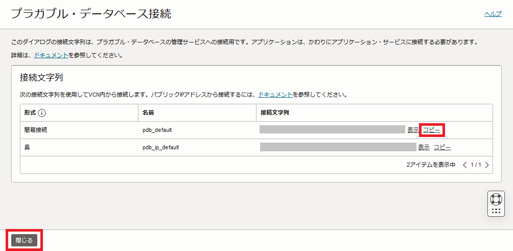 簡易接続の接続文字列の右にあるコピーをクリックし、クリップボードに簡易接続文字列をコピーします。 その後、閉じるをクリックし、ダイアログを閉じます。