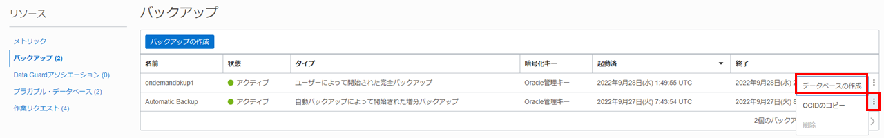 リストア対象のバックアップの右側にあるアクション・アイコン(3つのドット)から、データベース作成をクリックします。