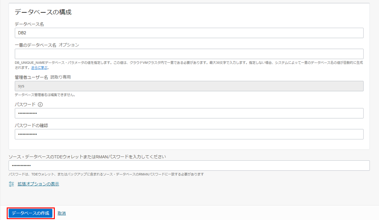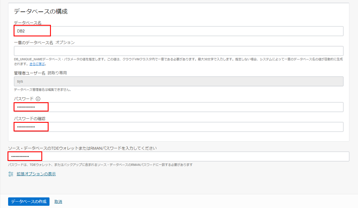 - ソース・データベースのTDEウォレットまたはRMANパスワードを入力してください - リストア対象のデータベースのTDEウォレットまたはRMANパスワードを入力します。