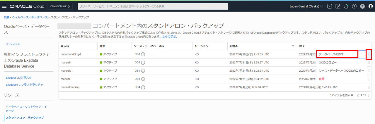 コンソールメニューからOracle Database → Oracle Public Cloud上のExadataを選択し、スタンドアロン・バックアップをクリックします。