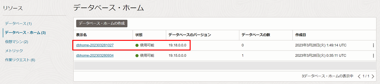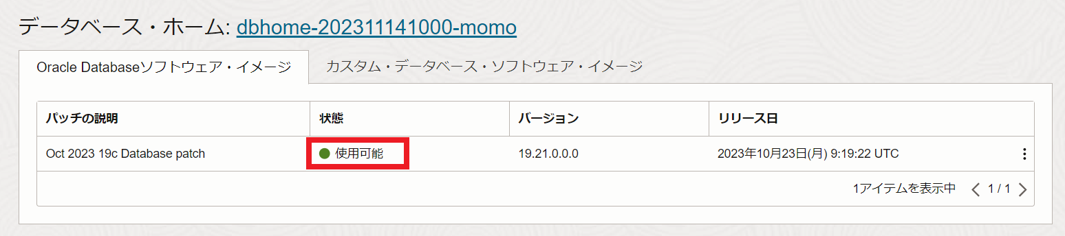 移動(パッチ適用)が完了すると、データベース・ホームの状態が使用可能に切り替わり、移動されたデータベース・ホームのデータベースの数が1に変更されます。