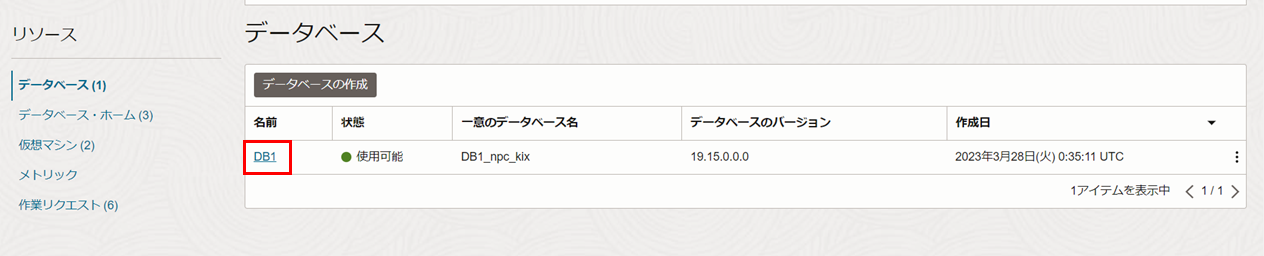 リソースの一覧からデータベースをクリックし、パッチを適用するデータベース名をクリックします。