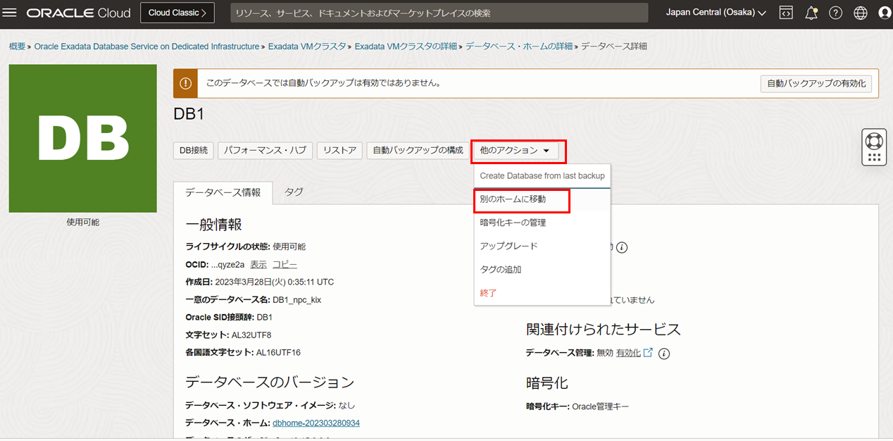 データベース詳細ページの他のアクションボタンをクリックし、別のホームに移動をクリックします。