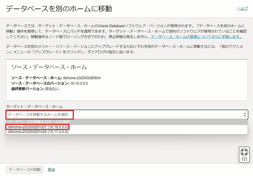 データベースを移動するホームを選択をクリックし、アップグレードしたいデータベースのバージョンのデータベース・ホームを選択します。