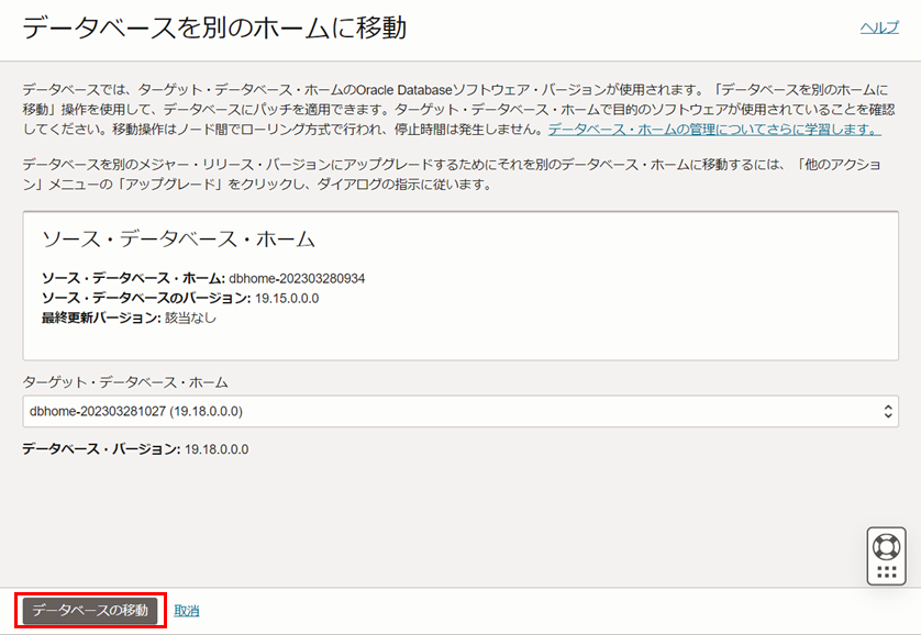 データベースの移動ボタンをクリックします。移動操作(パッチ適用)はノード間でローリング方式で行われます。