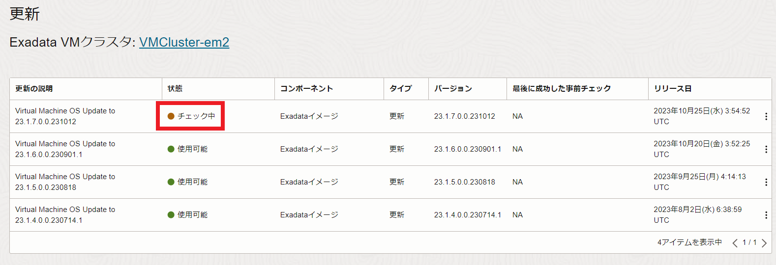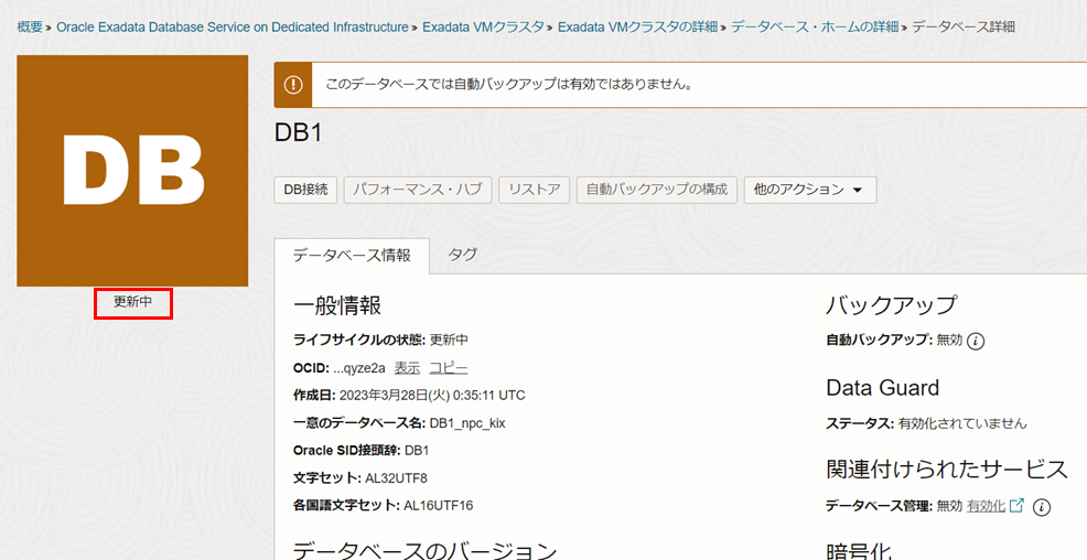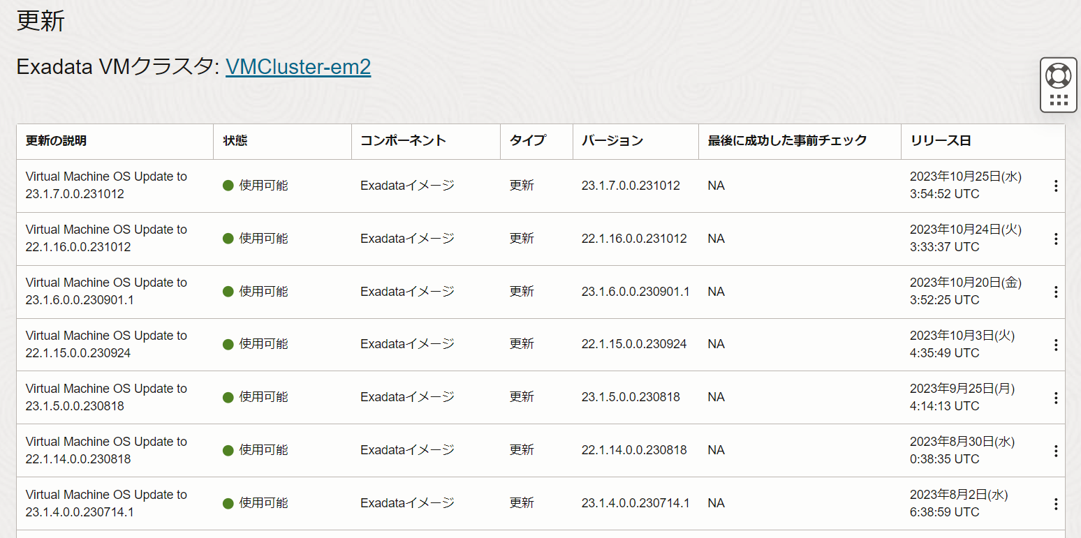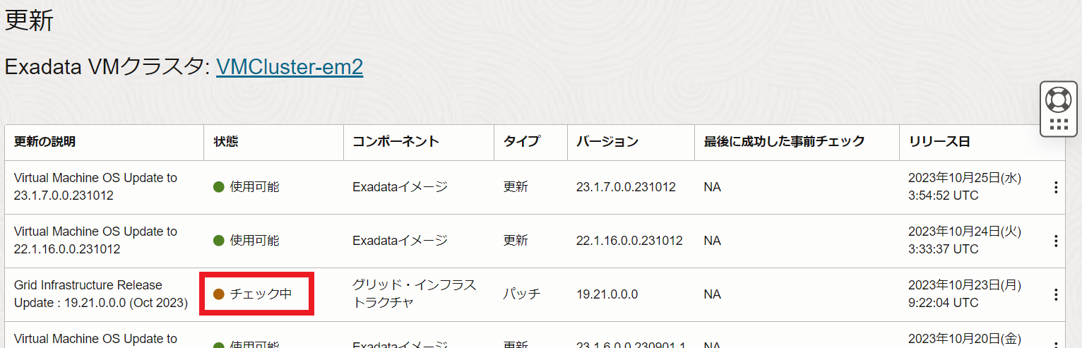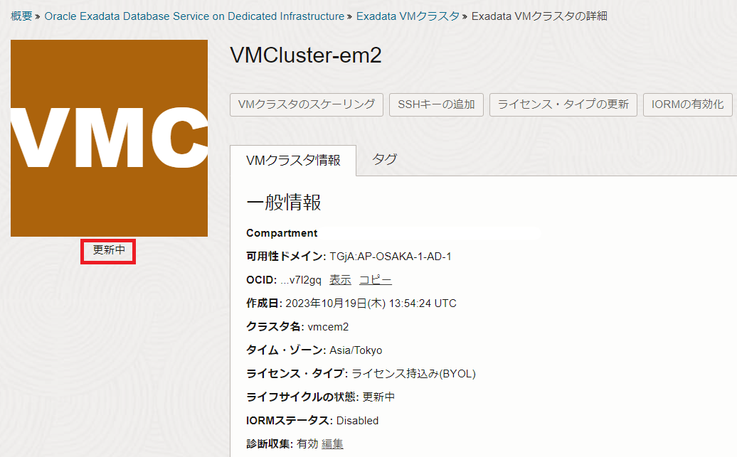 Exadata VMクラスタの詳細ページに戻ると、状態が更新中となっています。使用可能に切り替わるまで待機します。 パッチはDBサーバーへのローリングで適用されます。