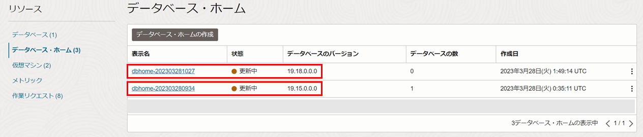対象のデータベースが配置されていたデータベース・ホームと移動先のデータベース・ホームの状態も更新中に切り替わります。