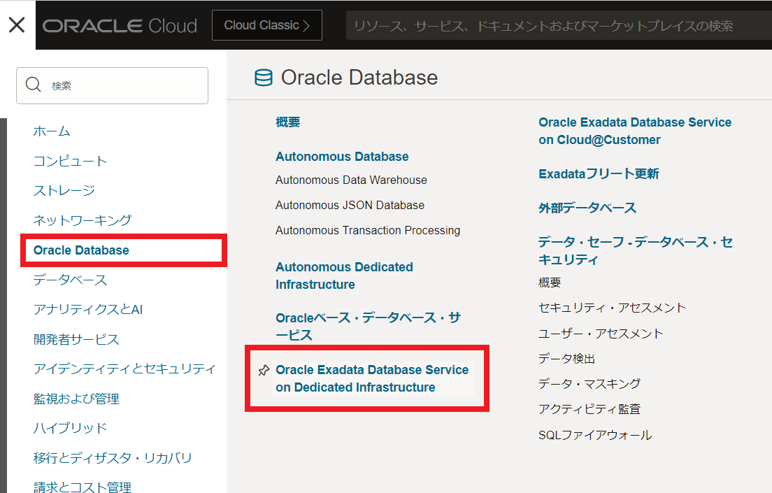 OCIコンソール・メニューから Oracle Database → ** Oracle Exadata Database Service on Dedicated Infrastructure** に移動します。