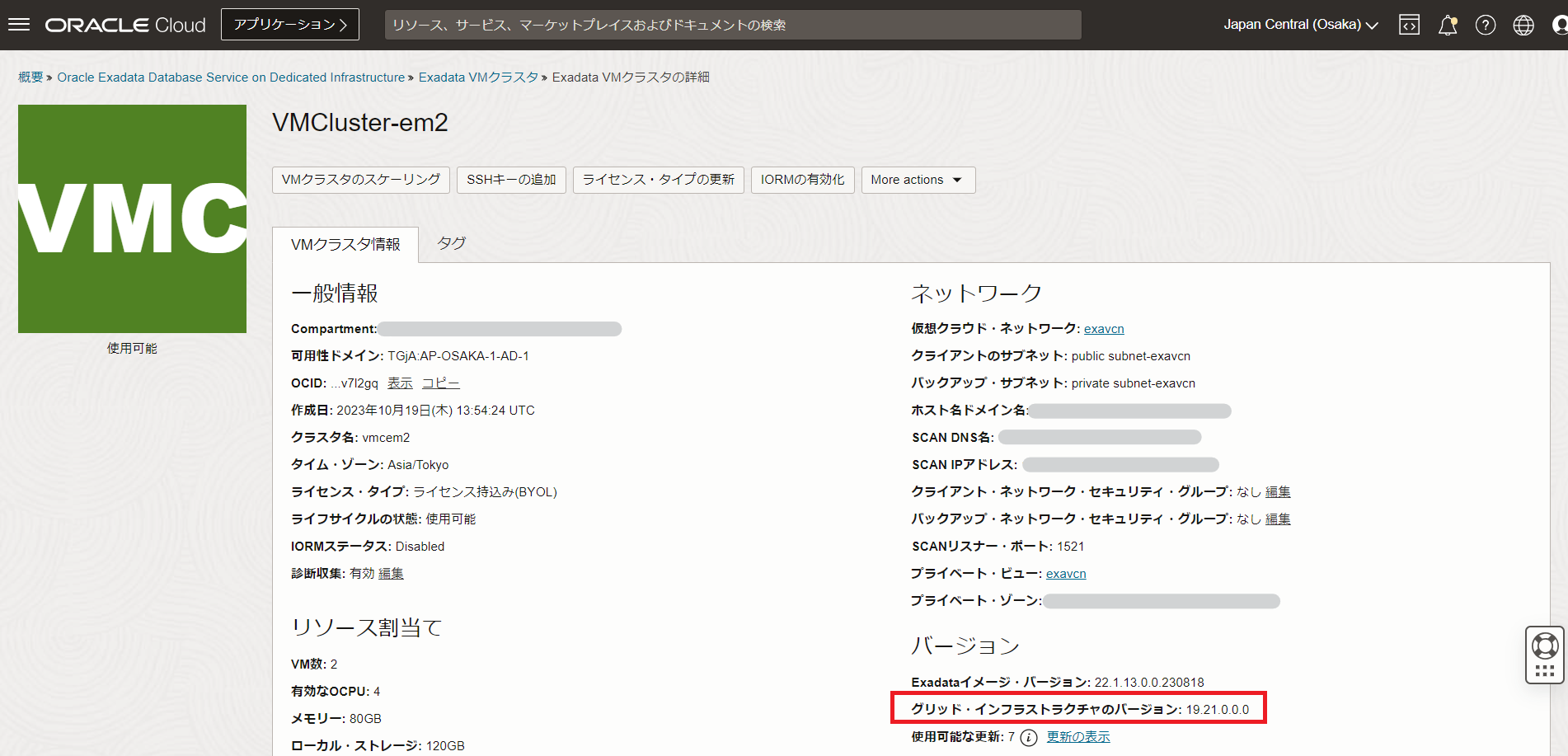 Exadata VMクラスタの詳細ページのグリッド・インフラストラクチャのバージョンで現在のGIのバージョンを確認できます。