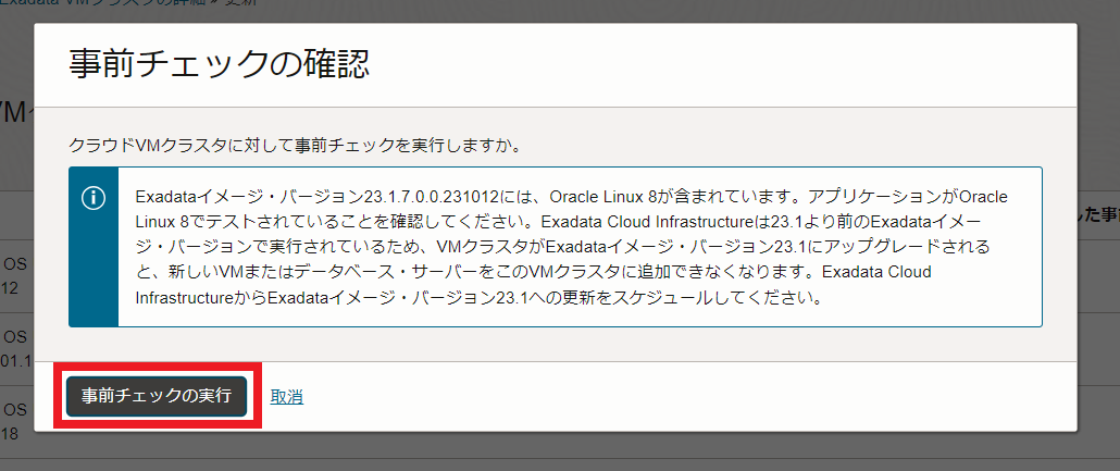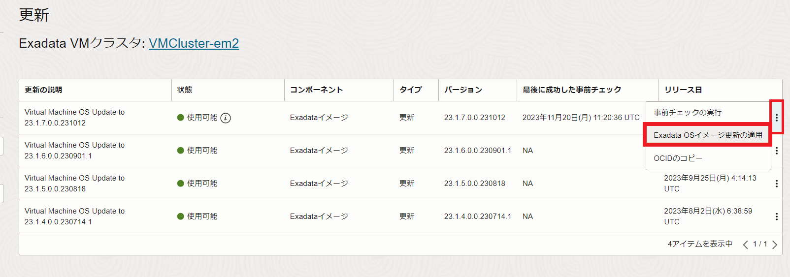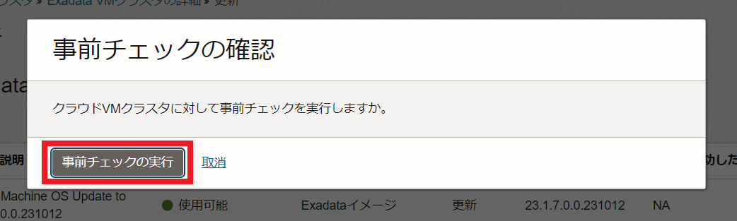 事前チェックで問題がなければ、アクション・ボタンをクリックして、Exadata OSイメージ更新の適用をクリックします。