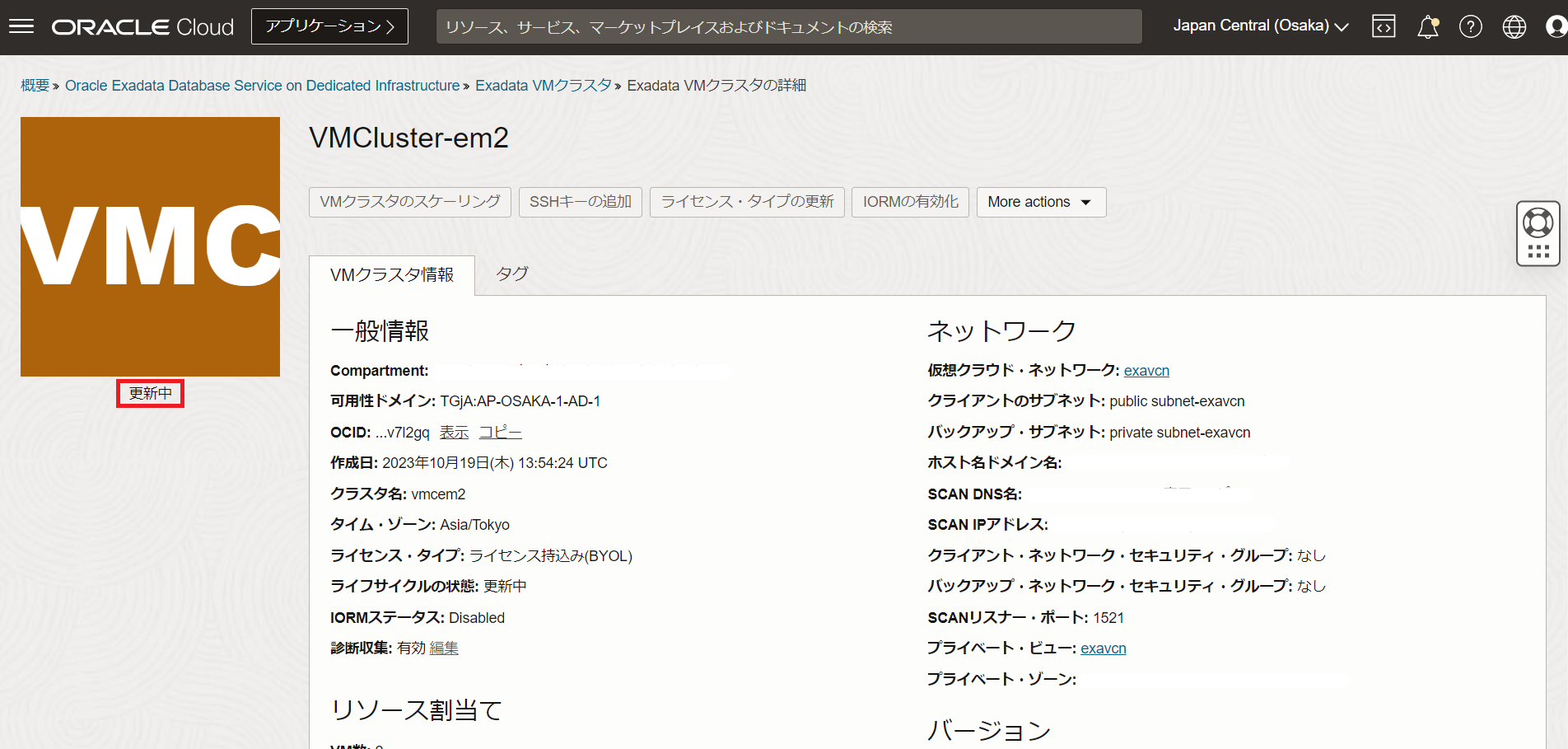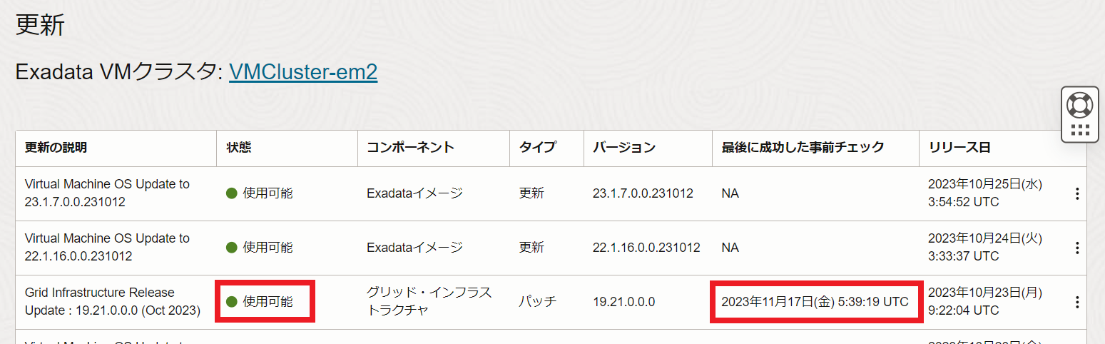 Exadata VMクラスタの詳細ページに戻ると、状態が更新中となっています。使用可能に切り替わるまで待機します。パッチはノード間でローリングで適用されます。