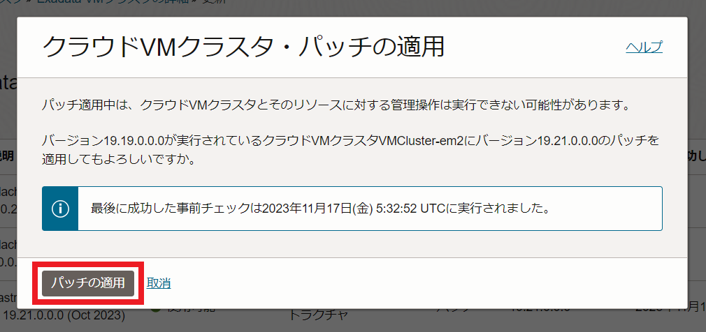 [root@orcl1 ~]# dbaascli patch tools list DBAAS CLI version 22.1.1.0.1 Executing command patch tools list Checking Current tools on all nodes orcl1: Patchid : 22.1.1.0.1_220223.0947 No applicable tools patches are available orcl2: Patchid : 22.1.1.0.1_220223.0947 No applicable tools patches are available All Nodes have the same tools version適用可能なパッチが存在する場合、以下のようになります。