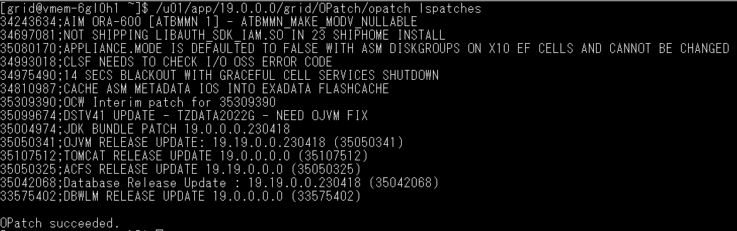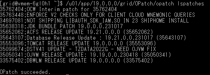 sudo su - grid /u01/app/19.0.0.0/grid/OPatch/opatch lspatches実行例: