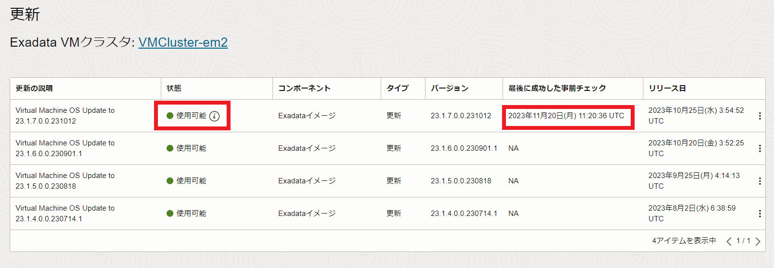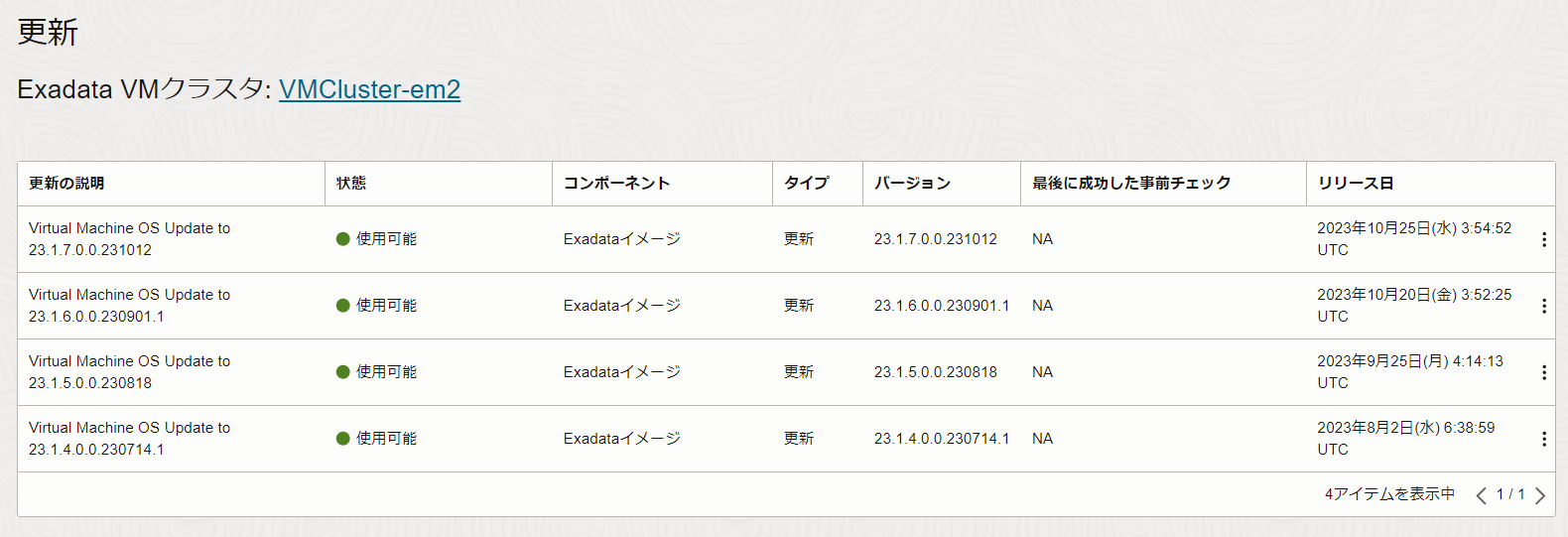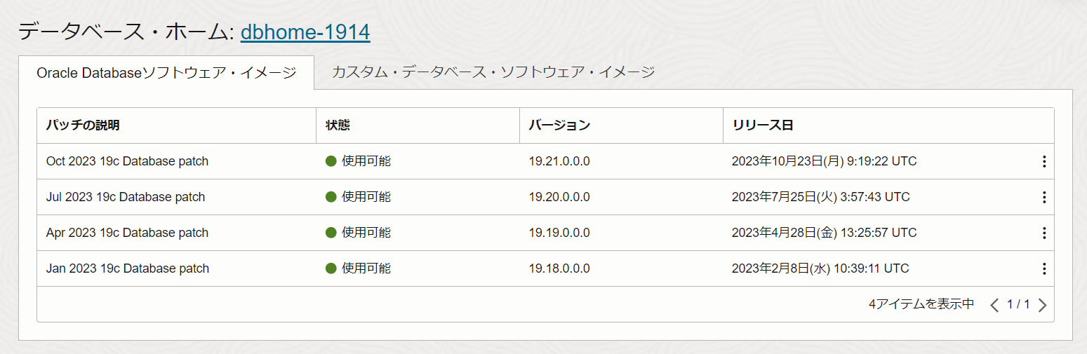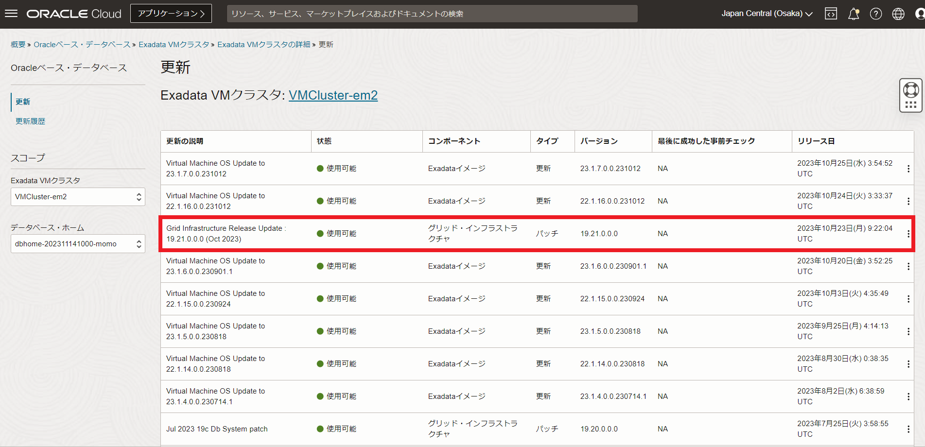 VMクラスタの状態が使用可能に切り替わり、パッチが成功すると、パッチの一覧から適用したパッチが消えます。適用したパッチはdbaascliを使用してロールバック出来ます。