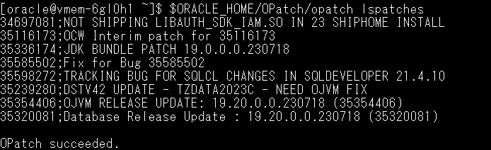 [oracle@vmem-6gl0h1 ~]$ $ORACLE_HOME/OPatch/opatch lspatches 34346703;PL23.1 PORTSPECEFIC NEW PLATFORM FOR CROSS TRANSPORTABLE PLATFORMS ADD IN KCPXPL_INIT 34697081;NOT SHIPPING LIBAUTH_SDK_IAM.SO IN 23 SHIPHOME INSTALL 35562836;DBUA IS PERFORMING VALIDATIONS ON ALL PDBS REGARDLESS THE TARGET PDBS PASSED IN -PDBS ARGUMENT 35638318;JDK BUNDLE PATCH 19.0.0.0.231017 35762404;OCW Interim patch for 35762404 35763448;ENFORCE V2 CHECKS ONLY FOR CLIENT CLOUD MNEMONIC QUERIES 35770294;CVE-2023-2976 GOOGLE GUAVA UPDATE TO AT LEAST 32.0.0 35239280;DSTV42 UPDATE - TZDATA2023C - NEED OJVM FIX 35648110;OJVM RELEASE UPDATE: 19.21.0.0.231017 (35648110) 35643107;Database Release Update : 19.21.0.0.231017 (35643107) OPatch succeeded.
