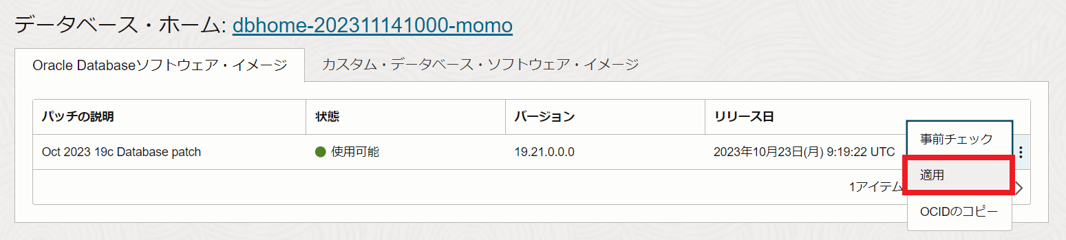適用可能なパッチの一覧が表示されます。(例では、19.21.0.0.0が適用可能)
