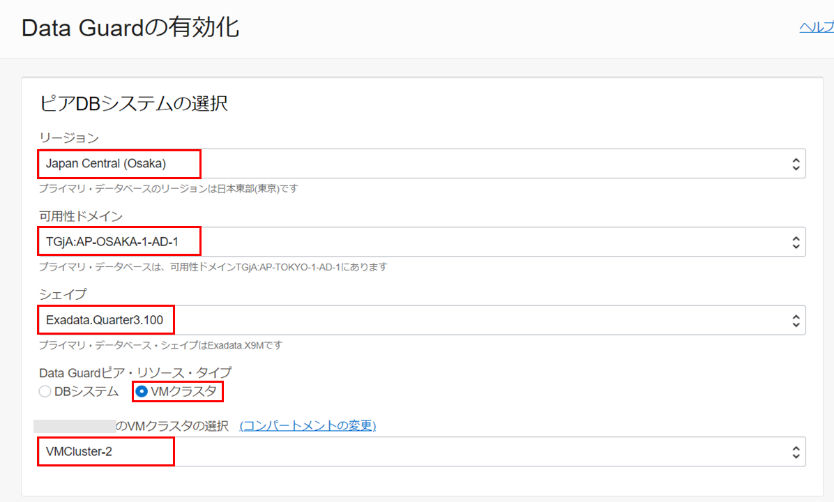 - [コンパートメント名]のVMクラスタの選択 - スタンバイ・データベースを作成したいVMクラスタを選択