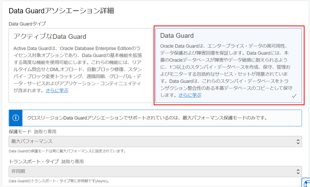 - Data Guardタイプ - アクティブなData GuardかData Guardを選択します。(本ガイドでは、Data Guardを選択します。)