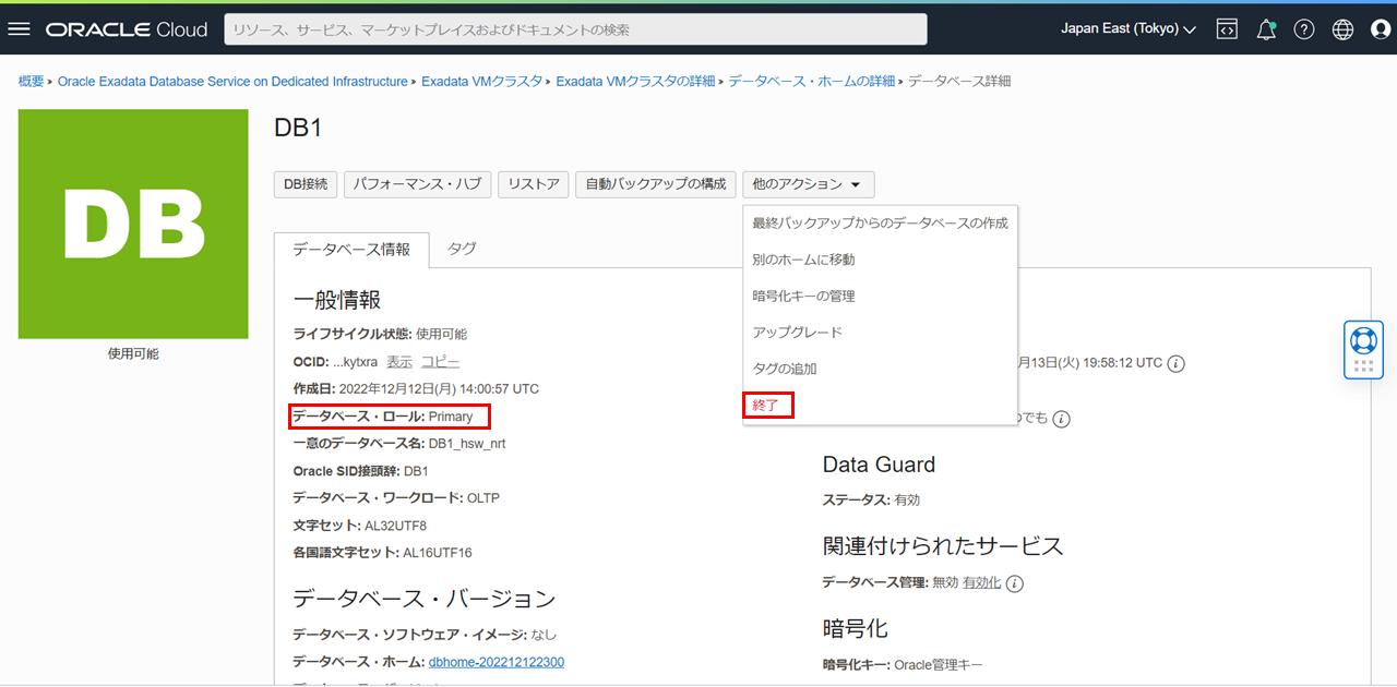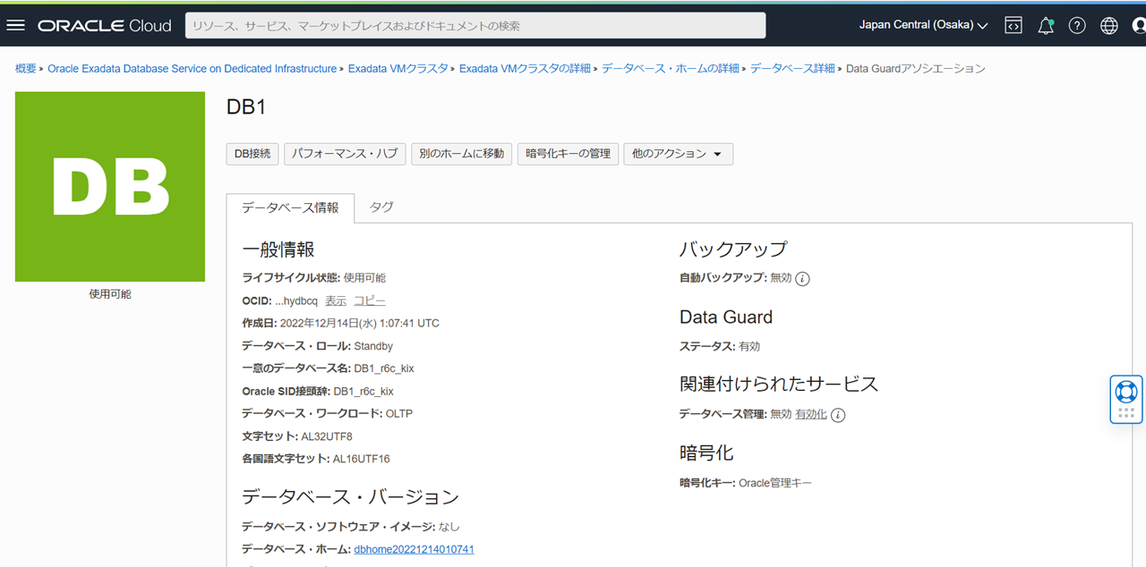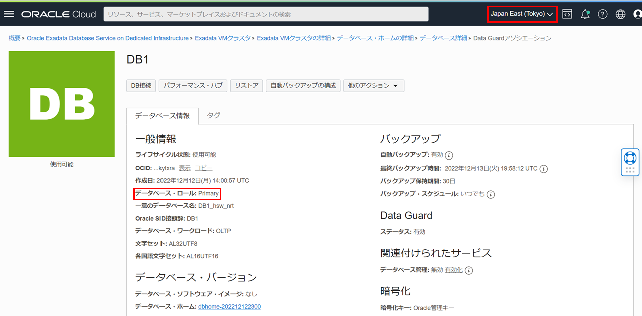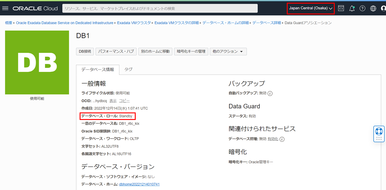 データベースの状態が使用可能になるとスタンバイ・データベース(本ガイドでは、東京リージョン)とプライマリ・データベース(本ガイドでは、大阪リージョン)のそれぞれのデータベース・ロールが変更されます。