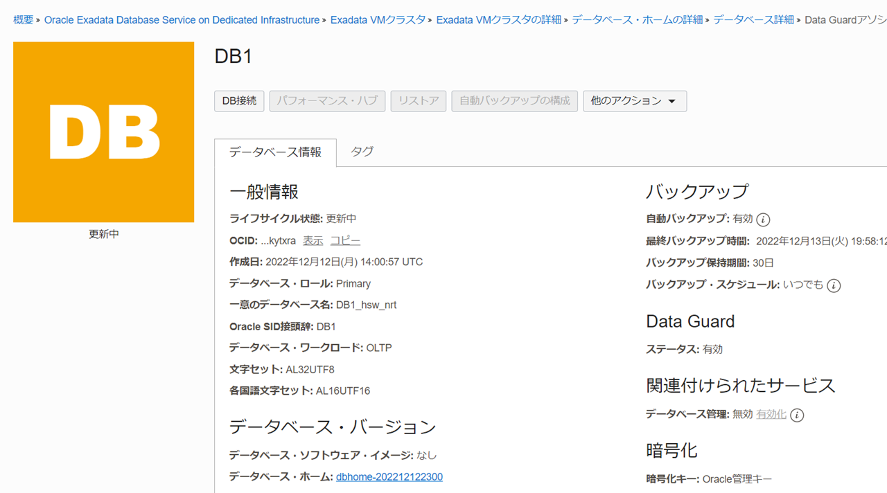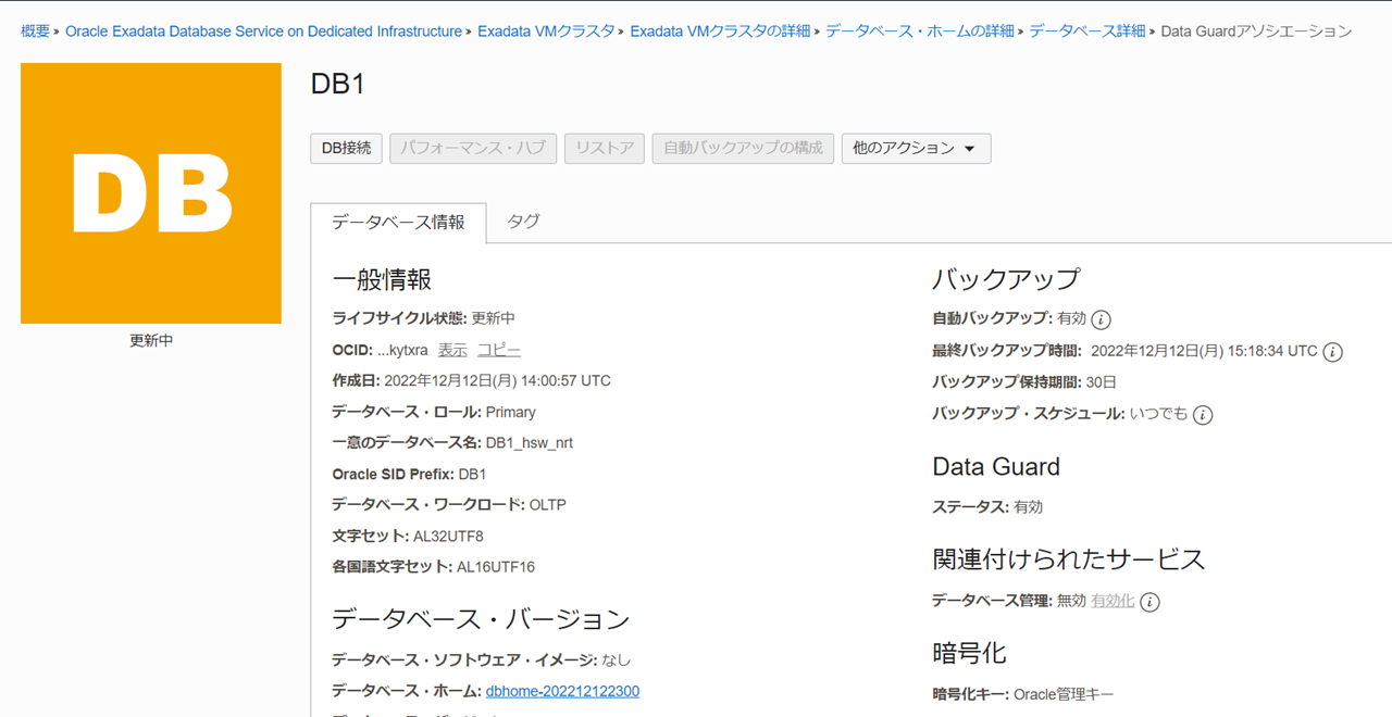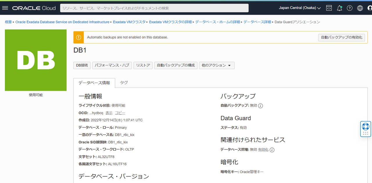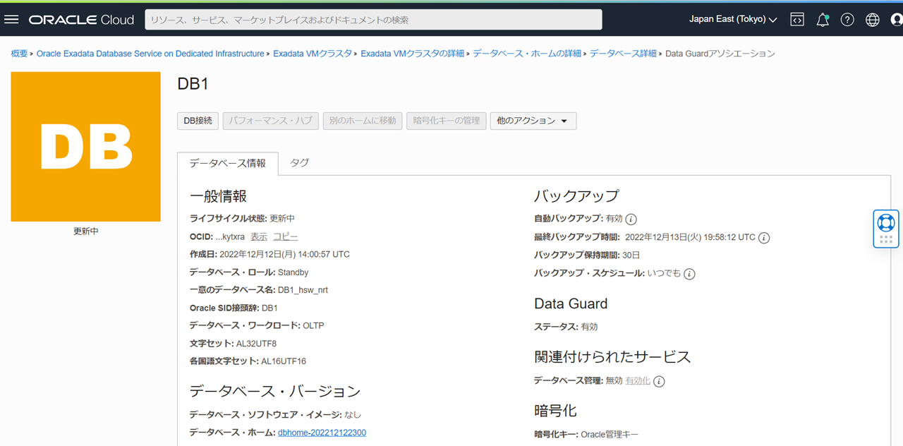 データベースの状態が使用可能になるとスタンバイ・データベース(本ガイドでは、東京リージョン)とプライマリ・データベース(本ガイドでは、大阪リージョン)のそれぞれのデータベース・ロールが変更されます。