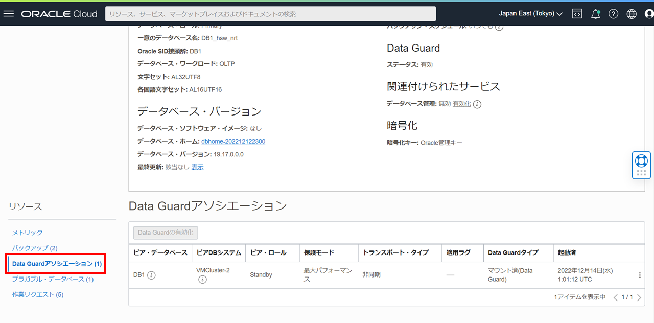 プライマリ・データベースのリージョン(本ガイドでは東京リージョン)のデータベース詳細のリソースの一覧からData Guardアソシエーションをクリックし、スタンバイ・データベースの情報が追加されていることを確認します。