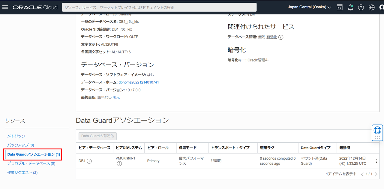スタンバイ・データベースのリージョン(本ガイドでは大阪リージョン)のデータベース詳細のリソースの一覧からData Guardアソシエーションをクリックし、プライマリ・データベースの情報が追加されていることを確認します。
